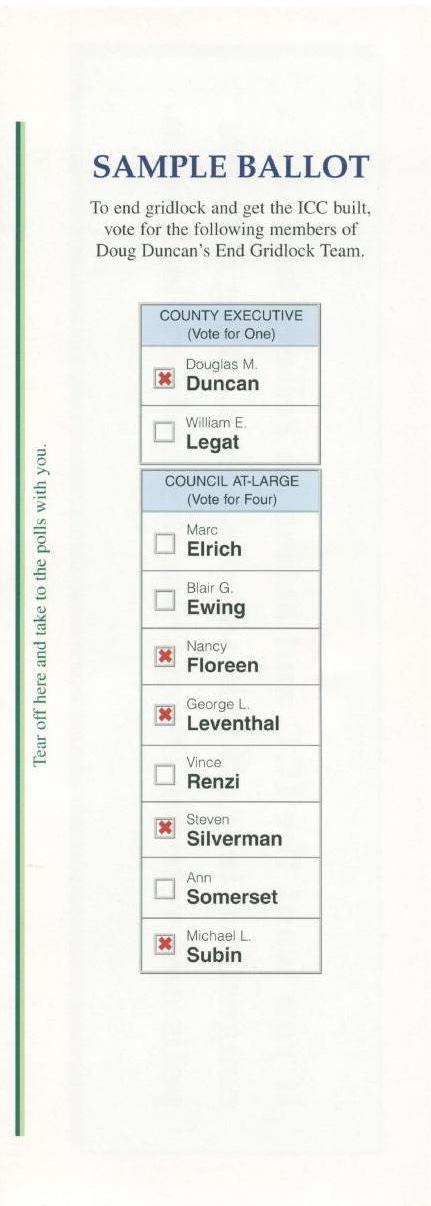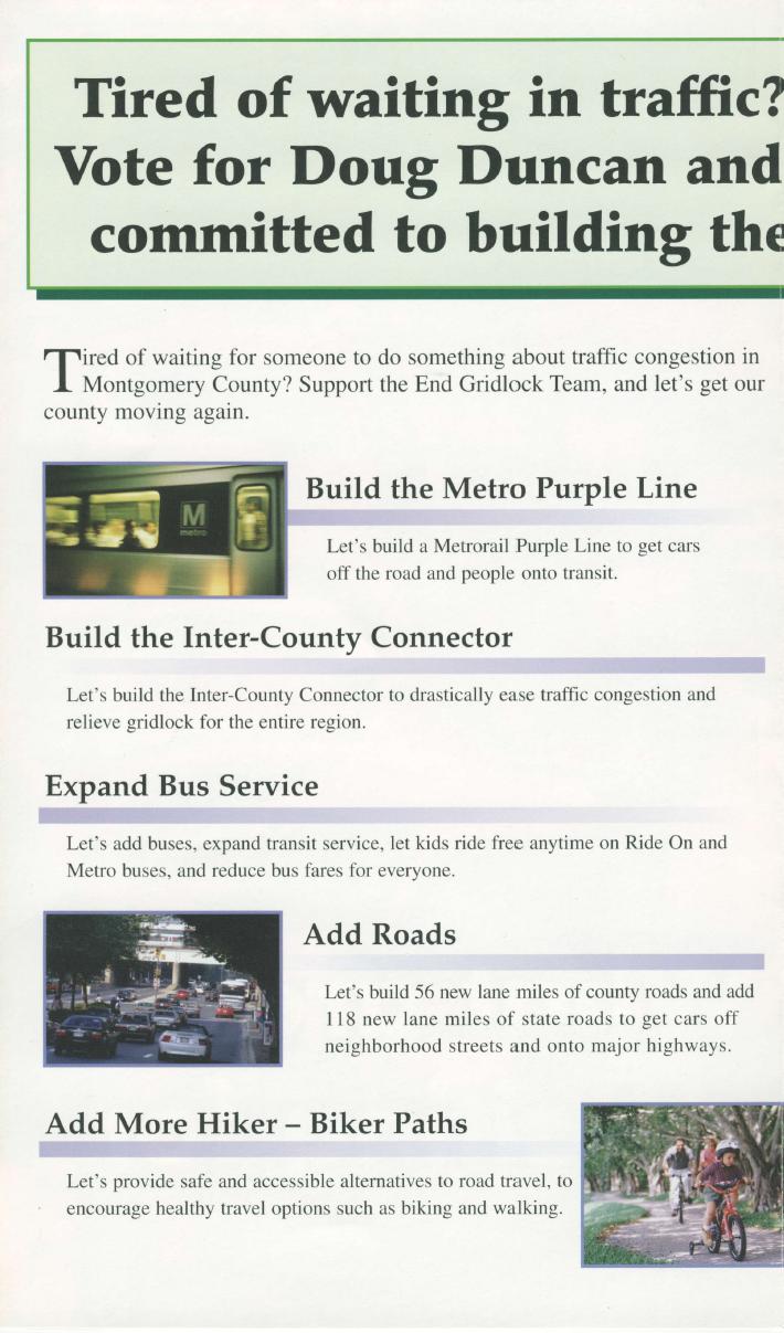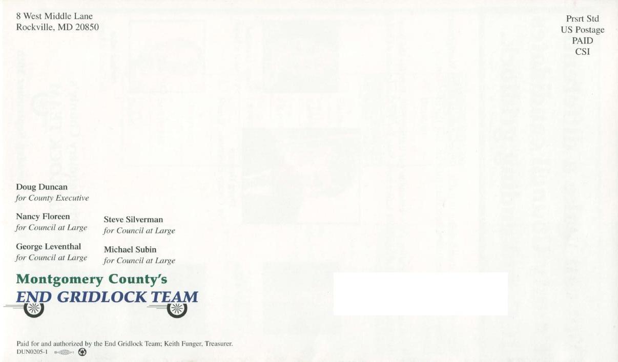 During the entire 1998-2002 term, freshman Council Member Blair Ewing battled County Executive Doug Duncan on the ICC, development policy, living wage and other issues. In the spring of 2002, intense speculation centered on whether Ewing would challenge Duncan in the primary. Ewing instead formed a slate of challengers to take over the council, prompting Duncan to form his own slate: the End Gridlock Team. Duncan’s team massively outspent Ewing and swept all the at-large seats. End Gridlock did many negative mailers, some of which we will be reprinting, but below is one of the positive ones.