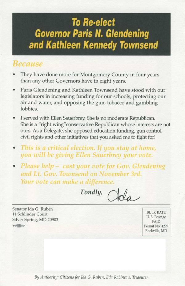 So back then, District 20 Senator Ida Ruben did her part, sending out the mailer below to her ultra-liberal constituents on behalf of Governor Parris Glendening. (We hope the Governor forgave her for mis-spelling his first name.) Ruben tore into GOP challenger Ellen Sauerbrey, saying: