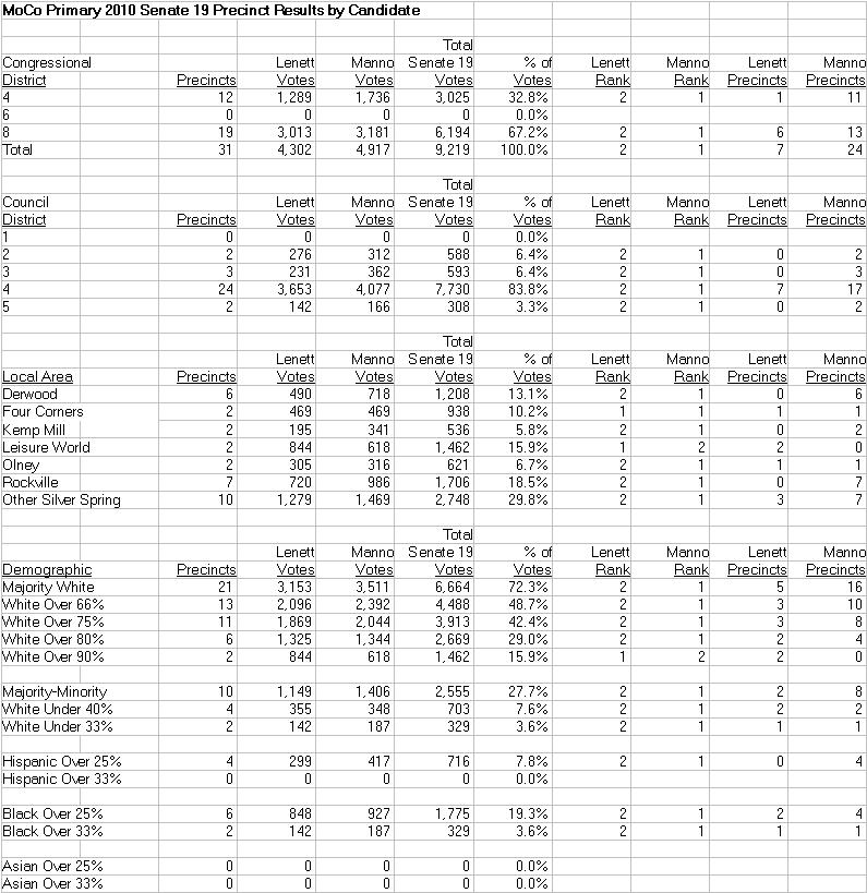 M MoCo Primary 2010: Senate 19 Precinct Results October 12, 2010 1 Min Read Categorized in: Maryland Politics Watch ArchivePolitics Tagged in: District 19, Mike Lenett, MoCo Primary Results 2010, Roger Manno Share Article: