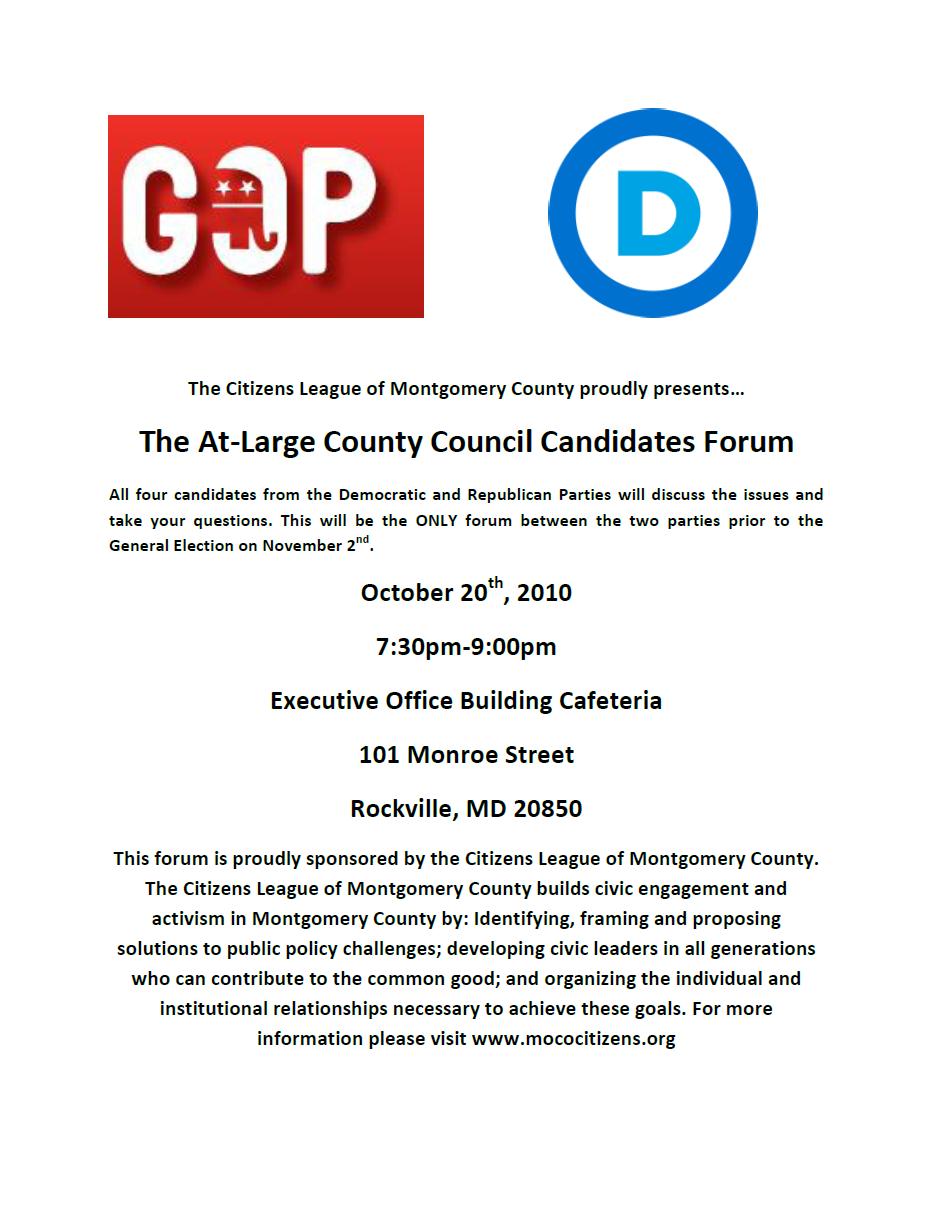C Council At-Large Forum: Wednesday Night in Rockville October 18, 2010 1 Min Read Categorized in: Maryland Politics Watch ArchivePolitics Tagged in: Council At-Large Share Article: