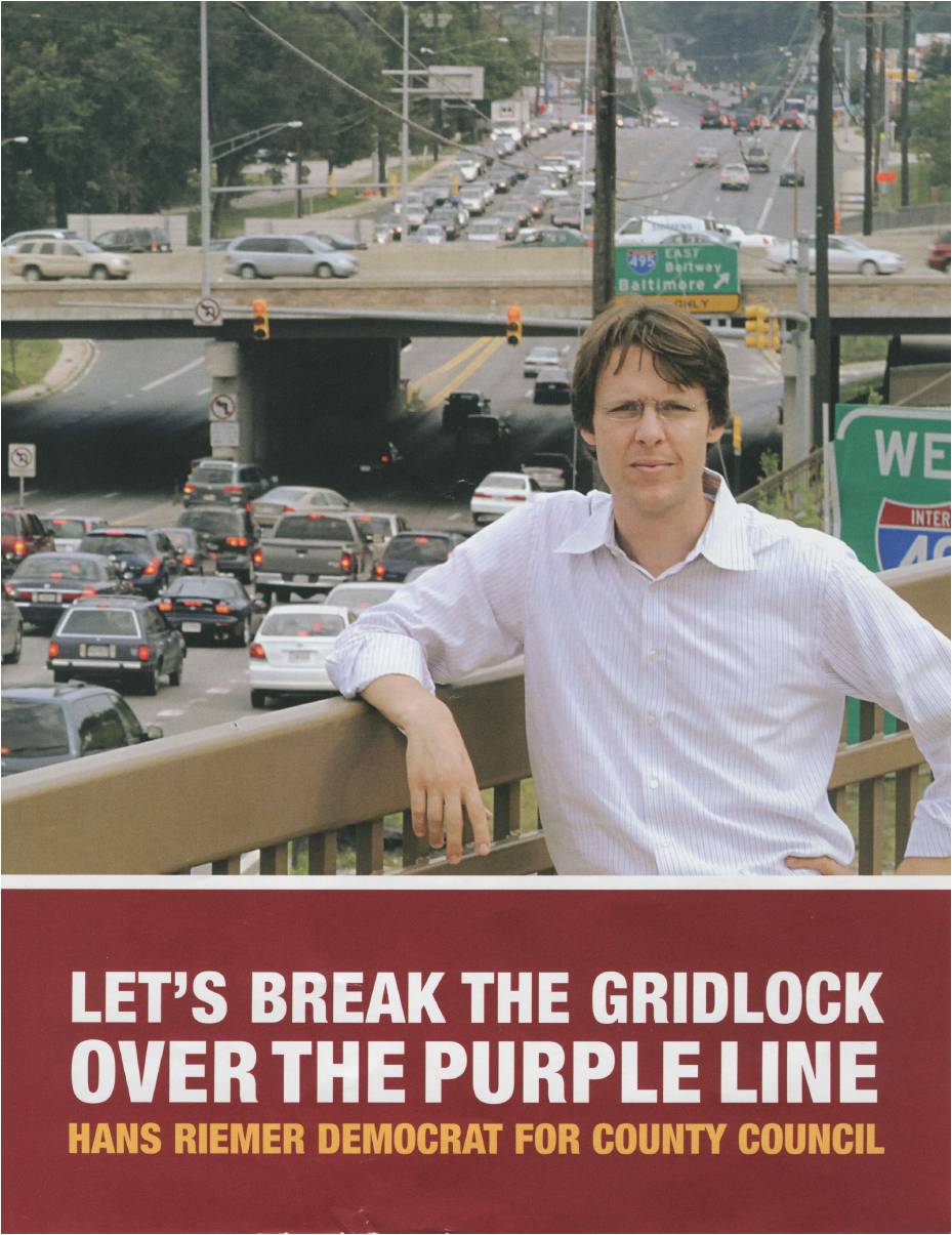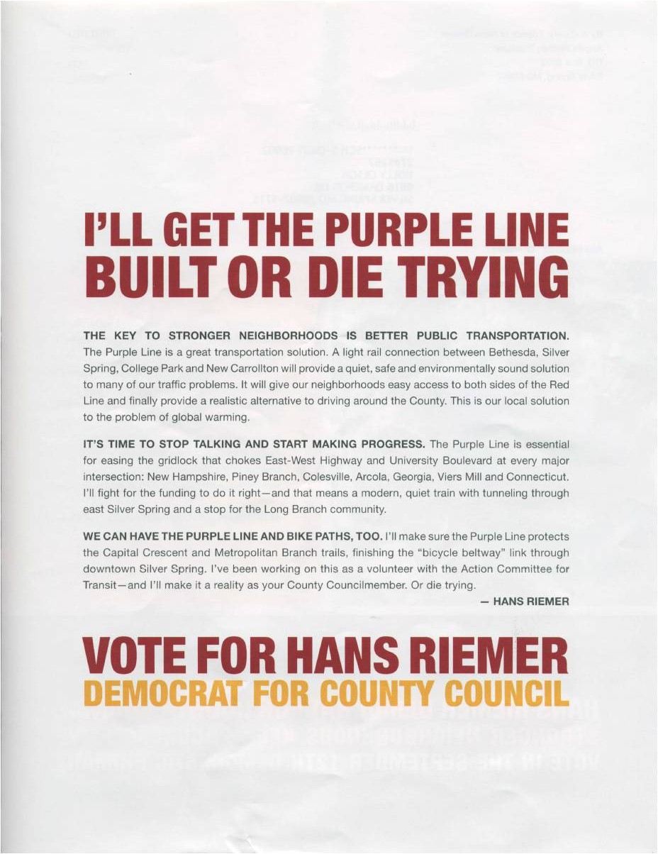 Hans Riemer has always been an ardently pro-transit candidate, even at the risk of his own health. In 2006, he ran for the open Council District 5 seat and sent out this mailer in which he vowed, “I’ll Get the Purple Line Built or Die Trying.” Hans lost the election, but he did survive the mailer. He is headed to Rockville after finishing second in this year’s council at-large primary.