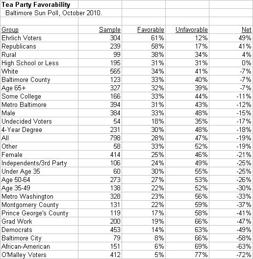 But look at the differences in net approval between Ehrlich voters and Republicans and everyone else. To the extent that the Tea Party is exercising influence over and is becoming associated with these two groups, it is isolating them from the rest of the state.