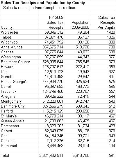 If Ehrlich does repeal the sales tax increase, who would benefit the most? The following chart illustrates per capita sales tax payments for every Maryland county (as well as Baltimore City).