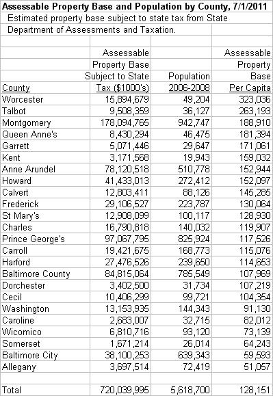 Ehrlich does not have much of a record of cutting taxes, but he does have a record of raising one tax in particular: the state property tax. In 2003, Ehrlich voted in favor of a property tax hike from 8.4 cents to 13.2 cents for every $100 in assessed value on the Board of Public Works. (The board cut the rate back to 11.2 cents in 2006.) That tax hike raised a net $692.9 million over four years. The state does not report its property tax revenues by county, but it does report each county’s assessable base, which drives property tax payments. Here is the estimated assessable base per capita for the tax year starting on 7/1/11.