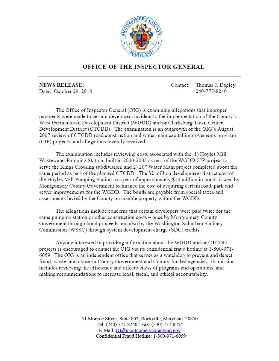I Inspector General Investigating Clarksburg – Again October 31, 2010 1 Min Read Categorized in: Maryland Politics Watch Archive Tagged in: Clarksburg Share Article: