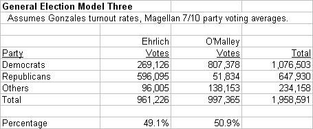 The best poll for Ehrlich in the entire cycle was Magellan’s July 2010 survey, which showed him getting 25% of Democrats and winning by three. Magellan works primarily for Republicans, so their estimates may be the best that Ehrlich will ever get. Also, this poll was taken before most of O’Malley’s attack ads hit. In our third model, we use Gonzales’s turnout forecast and Magellan’s party voting estimates. Under these assumptions, O’Malley wins by 1.8 points.