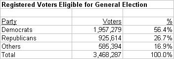 Of these three, only registration is known. Here is the number of voters by party who are eligible to vote in today’s general election.