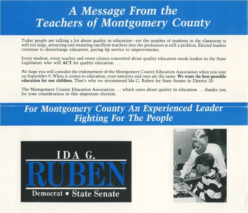 MCEA’s mailers for various County Council and state legislative candidates drew a lot of attention this year, but they are nothing new. Here is a mailer starring MCEA all the way back from 1986 on behalf of Delegate Ida Ruben (D-20), who successfully won a seat in the Senate and held it for 20 years. MCEA was with her to her final race.