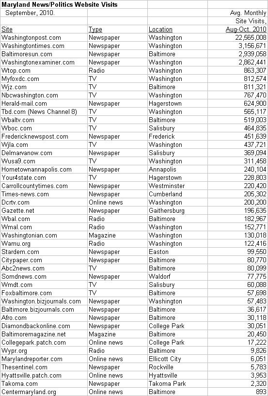 The Washington Post. The Baltimore Sun. NBC4. WBAL. The Gazette. These are a few of the many sources Marylanders go to for news and political coverage. But no one knows the relative readership of these sources on the Internet, which is becoming the premier platform for information delivery, because they do not report their site traffic. That ends today. Now, for the first time, we reveal all!