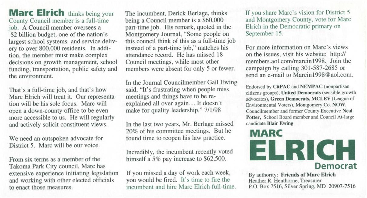 Council Member Marc Elrich finished first in this year’s at-large primary, but he had to travel a long, hard road to get there. Elrich ran for the District 5 council seat in 1990 and 1998 and at-large in 1994 and 2002 before finally winning in 2006. Perhaps his toughest race was in 1998 against District 5 incumbent Derick Berlage, whom Elrich labeled a “total hypocrite” for changing his position to accept developer contributions. Here’s a mailer Elrich sent out criticizing Berlage’s attendance record and his operating a law practice on the side. Berlage won the primary by a 7,954 to 6,422 vote.