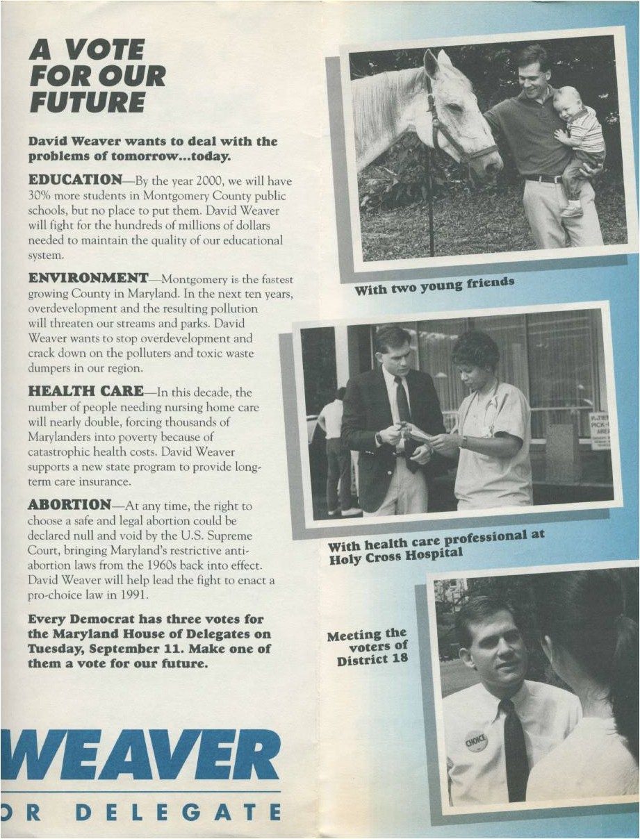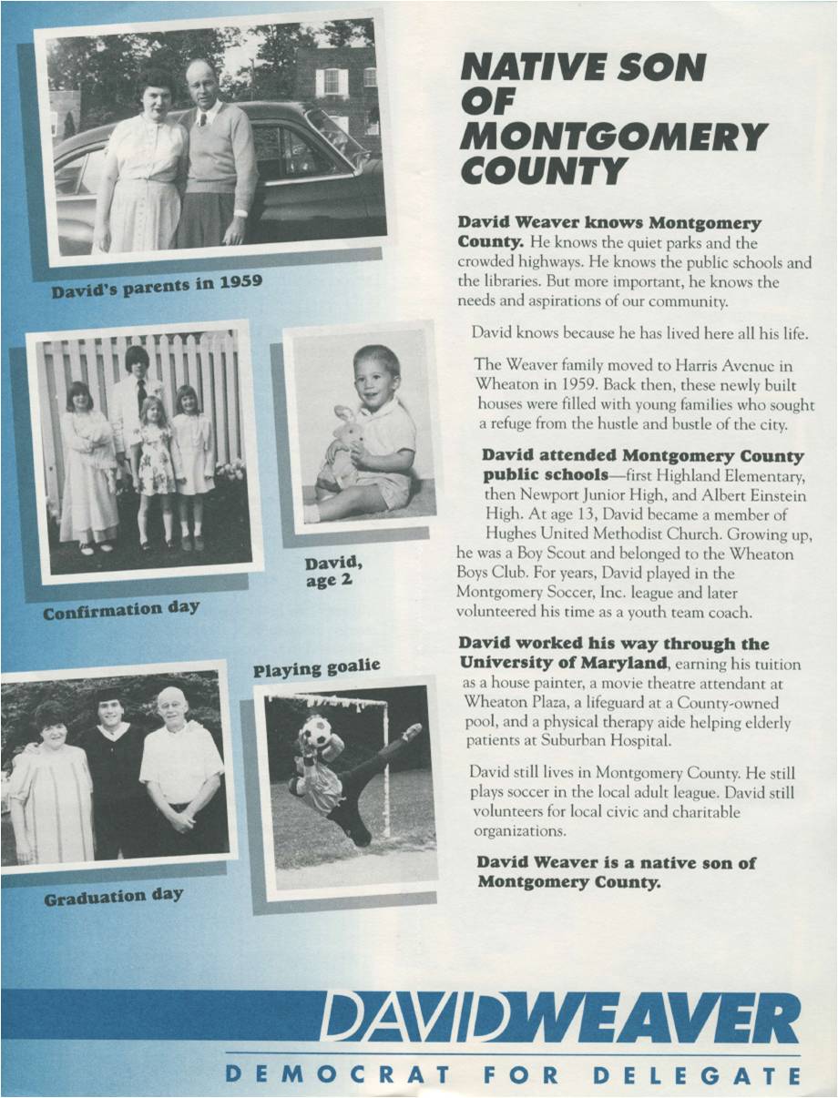 In 1990, Weaver ran for Delegate in District 18. He finished fourth behind Pat Billings, John Hurson and his future boss, Chris Van Hollen. That clearly did not stop him from being one of MoCo’s most influential citizens for decades. Here’s a lit piece from Weaver’s House run.