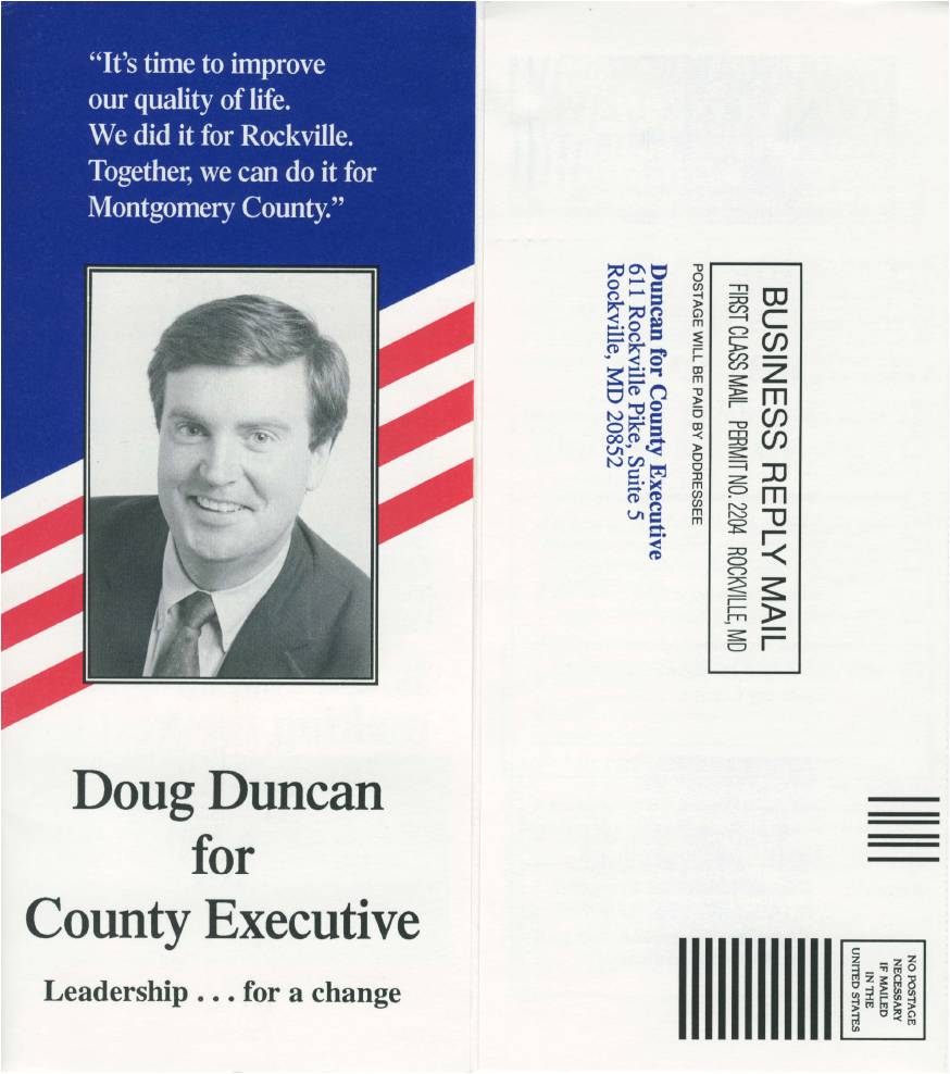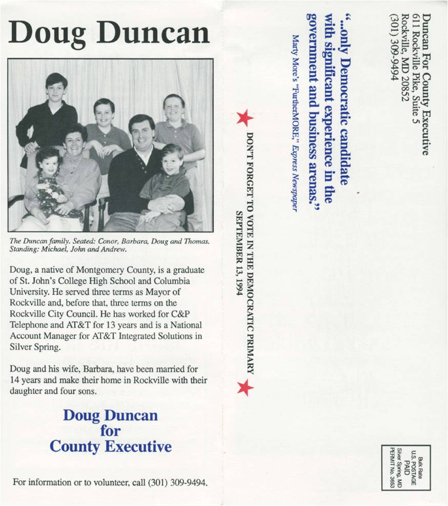 D Doug Duncan for County Executive, 1994 November 20, 2010 1 Min Read No other Montgomery County Executive has surpassed Doug Duncan’s twelve years in the position. This is a mailer from his first campaign for the office, a win in 1994. Categorized in: Maryland Politics Watch ArchivePolitics Tagged in: Doug Duncan, History Share Article: