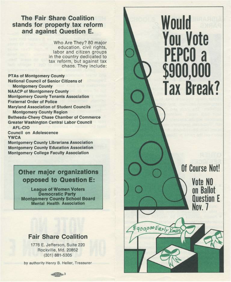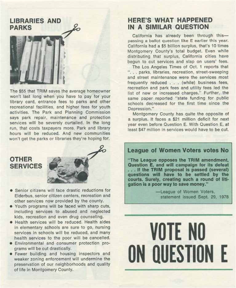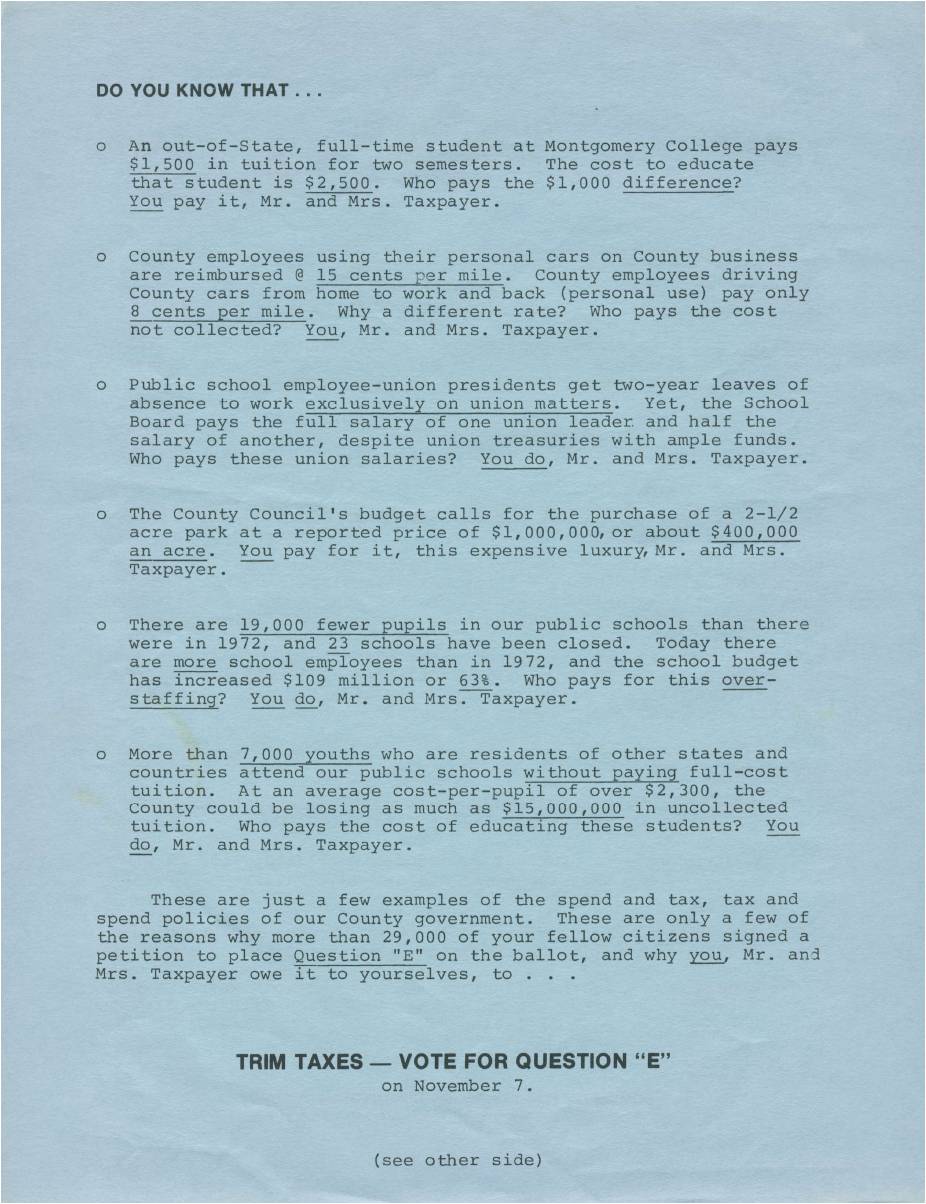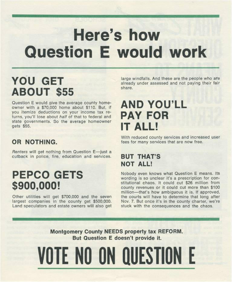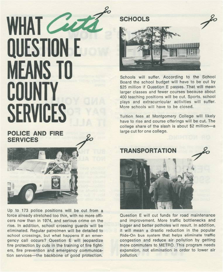 Prince George’s County is well-known for its TRIM amendment, a cap on property tax increases passed by referendum in 1978. Some blame TRIM for preventing the county from adequately funding schools and other basic services. MoCo also had a TRIM amendment on the ballot that same year, known as Question E. A giant coalition of unions, non-profits, civic groups and elected officials gathered to fight it. The anti-TRIM leadership included such notables as Council Members Norman Christeller, Neal Potter and Betty Scull; school board members Blair Ewing and Elizabeth Spencer; civic activist (and future Council Member) Don Praisner and MCEA’s Hank Heller, who would later become a state Delegate. Question E lost on a 71,083-76,731 vote. There is no question that it would have changed MoCo history if it had passed.