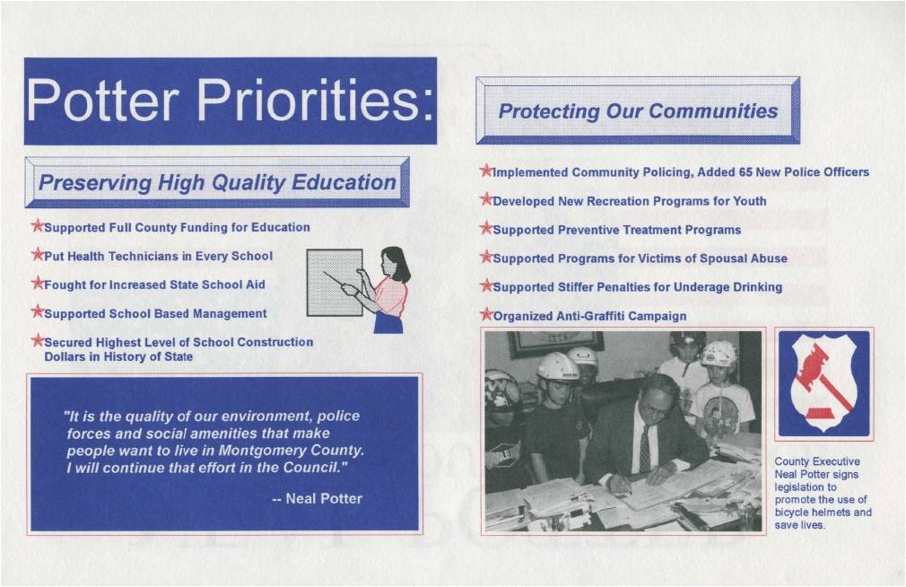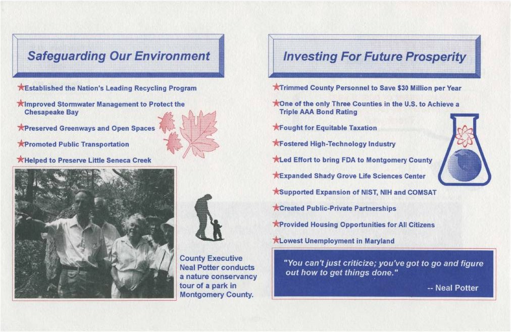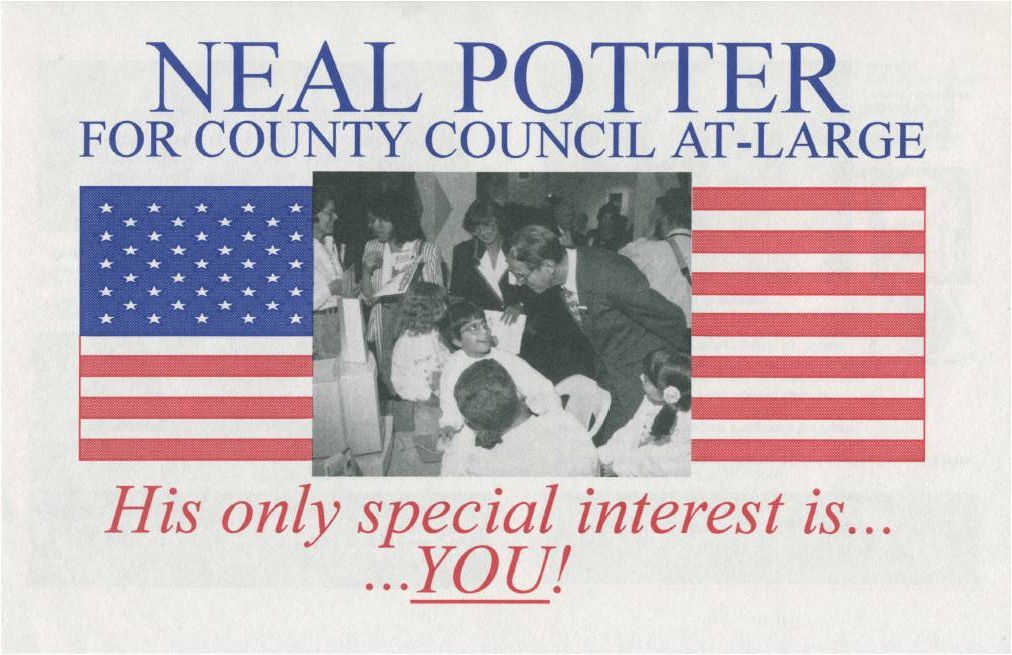 No one has won more countywide elections in MoCo than Neal Potter. The humble, squeaky-clean Chevy Chase resident won a County Council seat in 1970, 1974, 1978, 1982, 1986 and 1994, and served one term as County Executive starting in 1990. Here are two of his lit pieces: one from his third campaign in 1978 and one from his last.