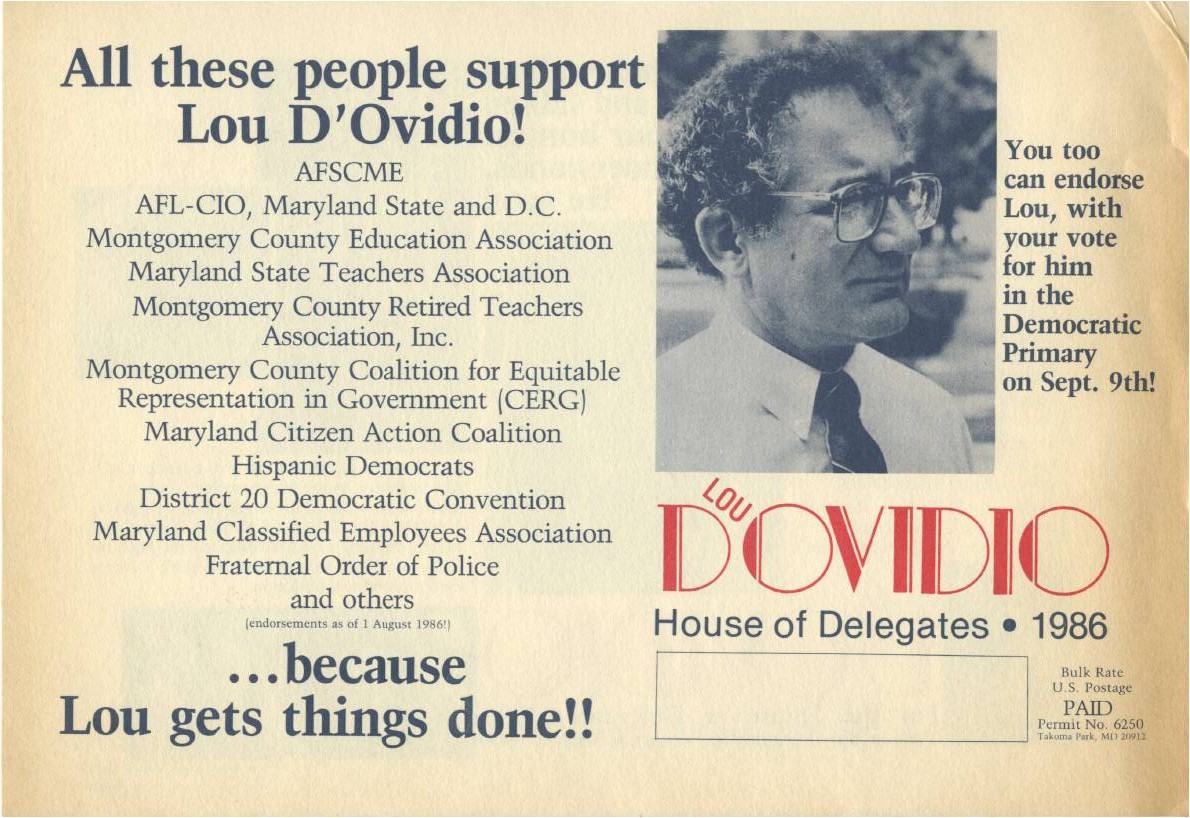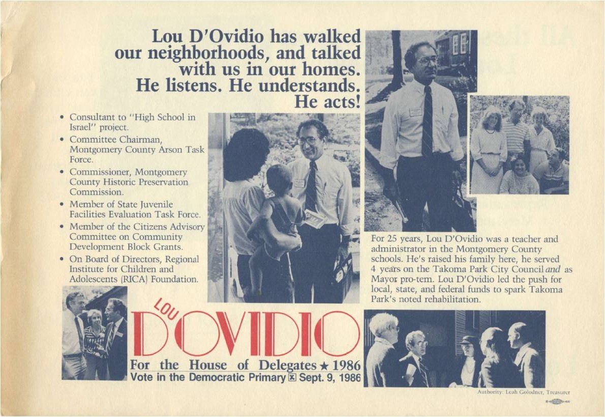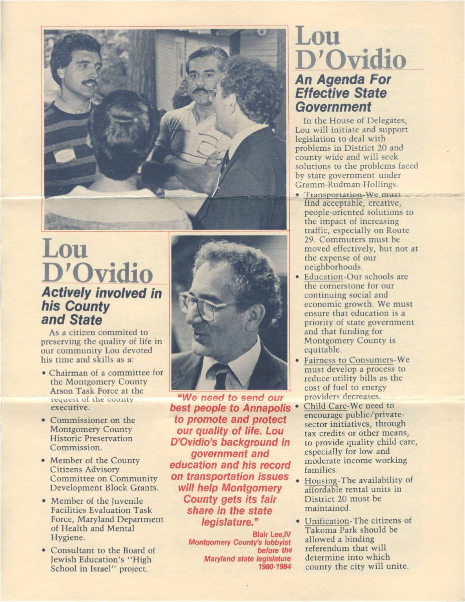 Lou D’Ovidio was a teacher and MCPS administrator for 25 years and served two terms on the Takoma Park City Council before running for a District 20 house seat in 1986. He ran on a slate with Delegate Ida Ruben (who was running for Senate), Delegate Sheila Hixson and House challenger Robert Berger. D’Ovidio finished fifth in the primary behind Peter Franchot, Hixson, Dana Dembrow and Berger. D’Ovidio went on to work for many years as Council Member Mike Subin’s Chief of Staff and now works for Roger Berliner. He remains one of the most respected veterans of Rockville. Here are two of his lit pieces from 1986. One of them even features a quote from Blair Lee!