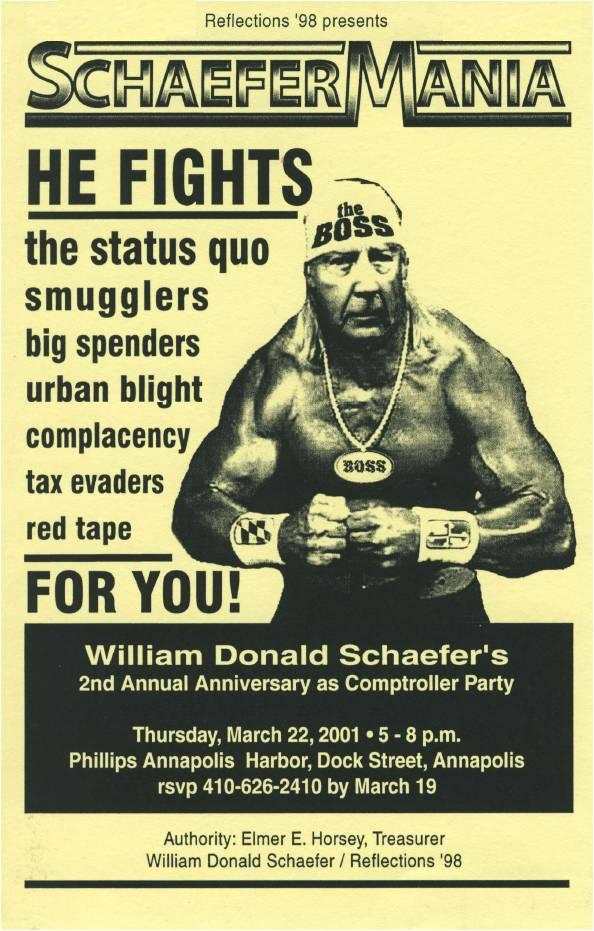 S SchaeferMania! November 21, 2010 1 Min Read William Donald Schaefer was one of Maryland’s great political characters. But this 2001 flyer celebrating his second anniversary as Comptroller leaves even your author speechless! Categorized in: Maryland Politics Watch Archive Tagged in: History, William Donald Schaefer Share Article: