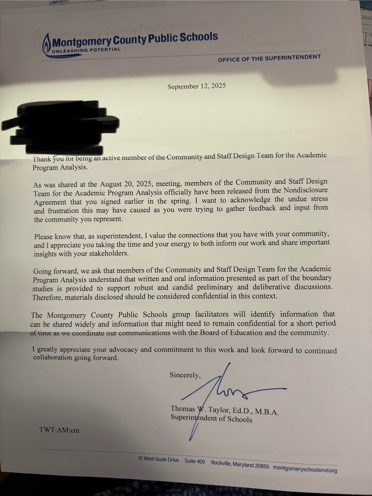 Superintendent Thomas Taylor heard the criticism of the NDAs. On September 12, Taylor wrote a letter to members of the district’s Community and Staff Design Team for the Academic Program Analysis informing them that they had been released from their NDA. Taylor wrote: