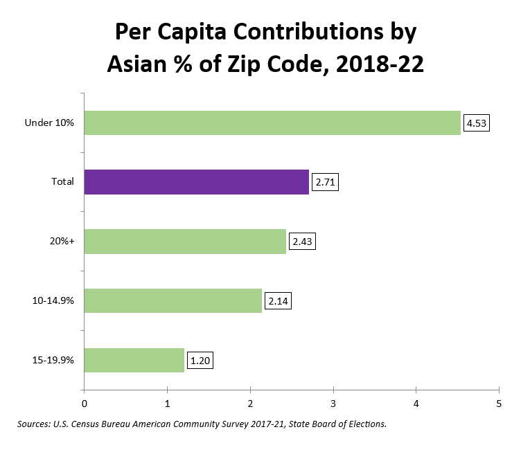 Zip codes with the lowest Asian percentages had the highest per capita contribution rates. Part of this was driven by Takoma Park, Kensington and western Bethesda, which all have low Asian population percentages and lots of contributions.