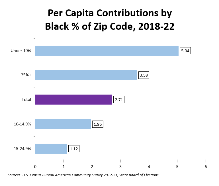 Zip codes with high Black percentages had above average contribution rates. This was driven primarily by Takoma Park and Downtown Silver Spring, which have large Black populations. But the highest contribution rates are in zip codes with few Black residents. This is largely due to lots of contributions from Bethesda, Kensington and Potomac, where the Black percentage is 6% or less.