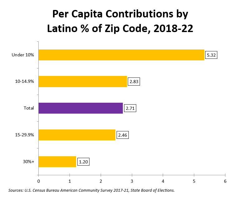 Here the correlation is clear: rising Latino percentage is associated with falling per capita contributions. That’s partly due to high contribution rates in Chevy Chase, Bethesda and Potomac, which have low Latino percentages, and low contribution rates in eastern Gaithersburg, Montgomery Village and Glenmont/Norbeck, which have high Latino percentages.