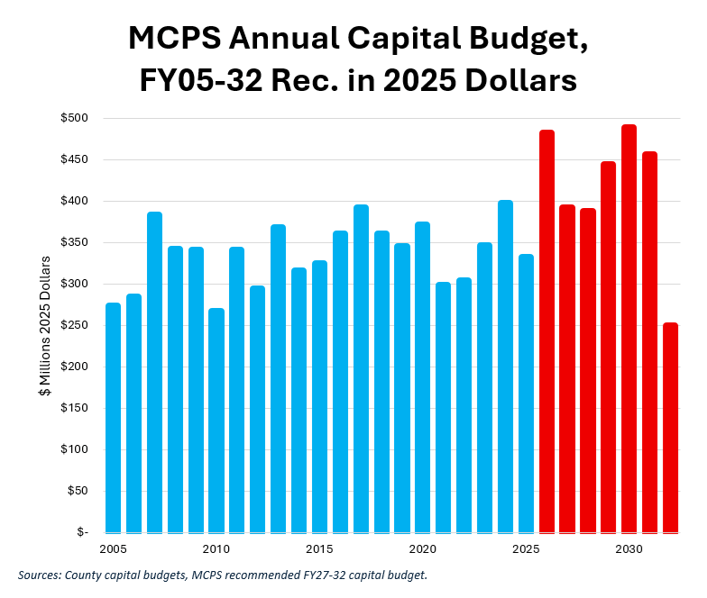 Let’s ignore that last bar since a year six estimate (and a low-balled one at that) can never be assumed to match reality when that year approaches. The annual average from FY05 through FY25 is $335 million in 2025 dollars. The annual average from FY26 through FY31 in Taylor’s recommendation is $442 million. So in historical terms and adjusted for inflation, Taylor is effectively asking for a 32% increase over what MCPS has gotten before.