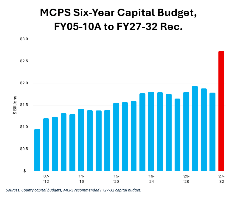 Let’s start with the total dollars in his request. Unlike the operating budget, which is annual in nature, the county’s Capital Improvements Program (CIP) is a six-year plan. Every even year (like 2026), the CIP is completely redrafted. Every odd year, it is amended. (Those amendments can be substantial.) MCPS’s CIP begins with a recommendation from the superintendent, then becomes a request by the school board, then goes to the county executive for a recommendation in January and is finally decided by the county council (along with the operating budget) in May.