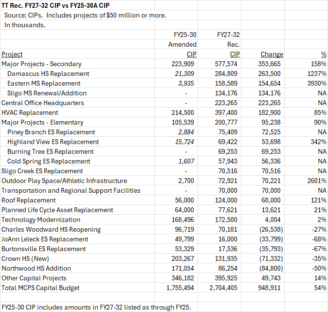 Eight new or newish projects ate up that money and a whole lot more. They are Damascus HS Replacement, Eastern MS Replacement, Sligo MS Renewal/Addition, Piney Branch ES Replacement, Highland View ES Replacement, Burning Tree ES Replacement, Cold Spring ES Replacement and Sligo Creek ES Replacement. In the old CIP, those projects accounted for $45 million in spending combined. Most of them had zero or very little money programmed. In Taylor’s recommended CIP, they account for a combined $920 million, an increase of $875 million. That’s close to the entire $949 million increase in Taylor’s recommendation.