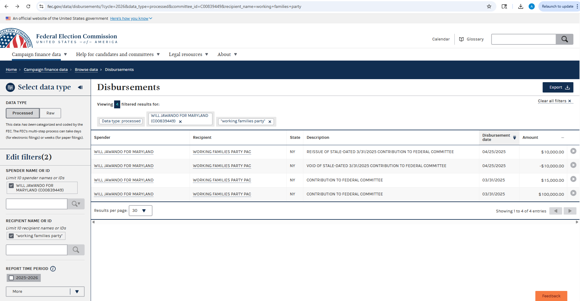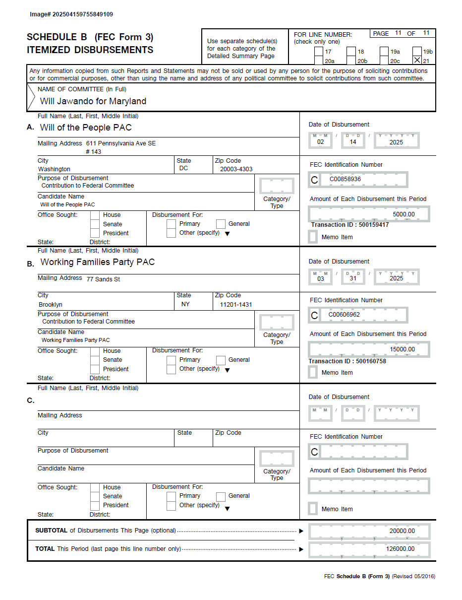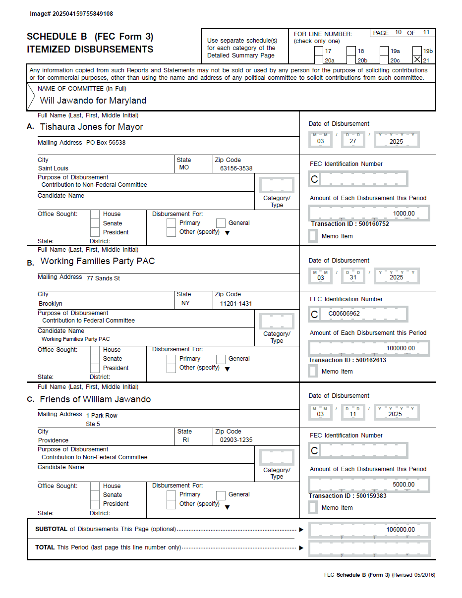 On July 15, 2025, Jawando terminated his U.S. Senate account. Prior to its closing, Jawando used it to send contributions of $100,000 and $15,000 to the Working Families Party PAC on March 31. The images below also show contributions to his federal PAC and to his traditional state-level account (which he never closed) of $5,000 each.
