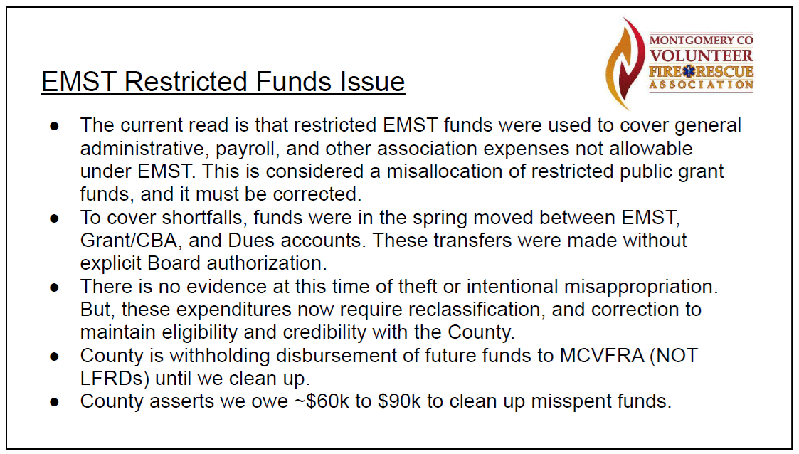 3. The association gets emergency medical services transportation (EMST) funds from the county government, but their use is restricted to emergency medical services staffing, support, recruitment/retention, and readiness. Instead, this money was used for general spending. The county wants that corrected, asserts that the association owes it $60,000-90,000 and “is withholding disbursement of future funds to MCVFRA (NOT LFRDs) until we clean up.” This issue is discussed in the slide below.
