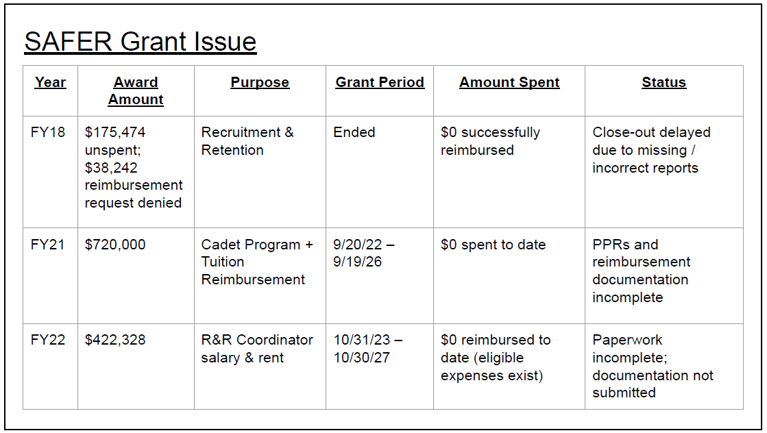 There is no evidence of criminal or malintent. What we know is that some expenditures charged to the EMST account do not meet the allowable-use rules for that program. That means those expenses must be reclassified to the correct funding source. We also know that there were significant SAFER funds that were not requested for reimbursement. These are compliance issues, not a question of personal gain or missing funds. We are taking the appropriate steps to correct the record, protect our eligibility going forward, and strengthen controls so this does not happen again.