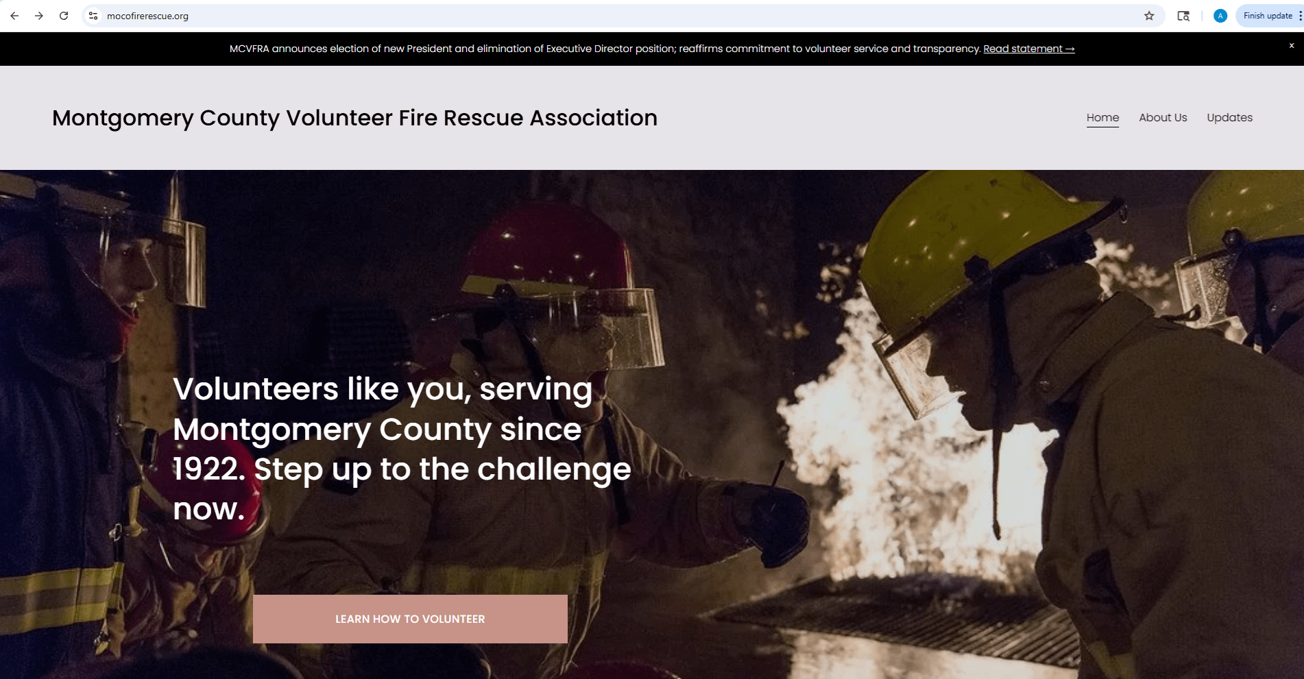 The Montgomery County Volunteer Fire Rescue Association (MCVFRA) has been working closely with our member departments and county partners to ensure long-term financial stability and to maintain the support our volunteer emergency responders rely on to deliver lifesaving services in every community we serve. When financial concerns surfaced over the summer, the Board moved quickly to strengthen oversight by establishing a finance committee and undertaking a comprehensive review of our operating structure and budget practices. As part of that review, the Board elected to restructure the organization by discontinuing the Executive Director position. We are also working to ensure that all available revenue sources are fully pursued, including completing federal SAFER grant reimbursement submissions and reconciling Emergency Medical Services Transport (EMST) accounts with our County partners to support a forthcoming disbursement.