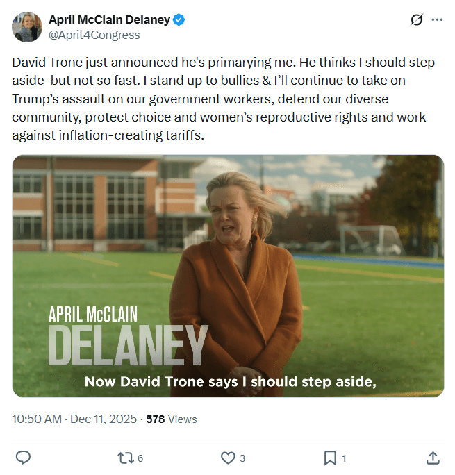 Congresswoman April McClain Delaney has released a statement and a video responding to the primary challenge announced by her predecessor, former Congressman David Trone. They are reprinted below, along with an X post in which she declares “I stand up to bullies.”