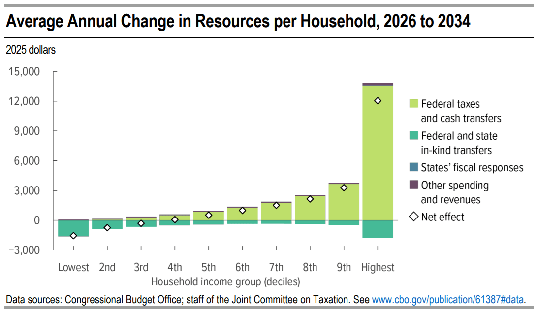 CBO estimates that if the legislation was enacted, U.S. households, on average, would see an increase in the resources available to them over the 2026–2034 period. The changes would not be evenly distributed among households. The agency estimates that in general, resources would decrease for households toward the bottom of the income distribution, whereas resources would increase for households in the middle and top of the income distribution.