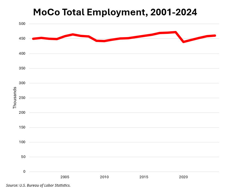 MoCo had just 0.4% growth in total employment last year. That’s below the region total and behind six of our nine competitors.