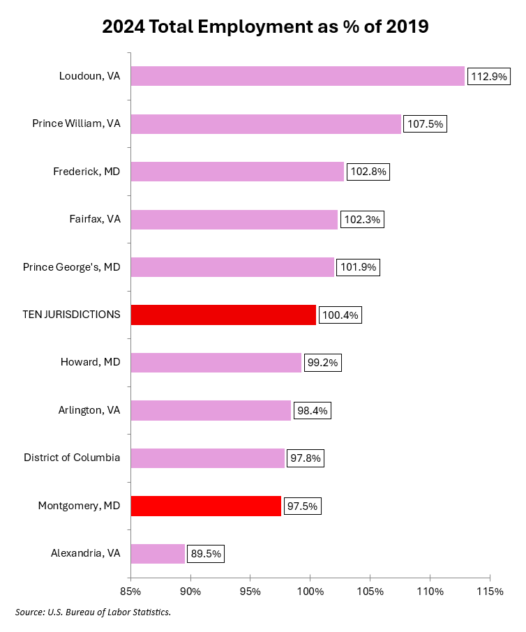 The chart below shows 2024 total employment as a percentage of 2019 total employment. This measures the degree to which each jurisdiction has bounced back from the pandemic.