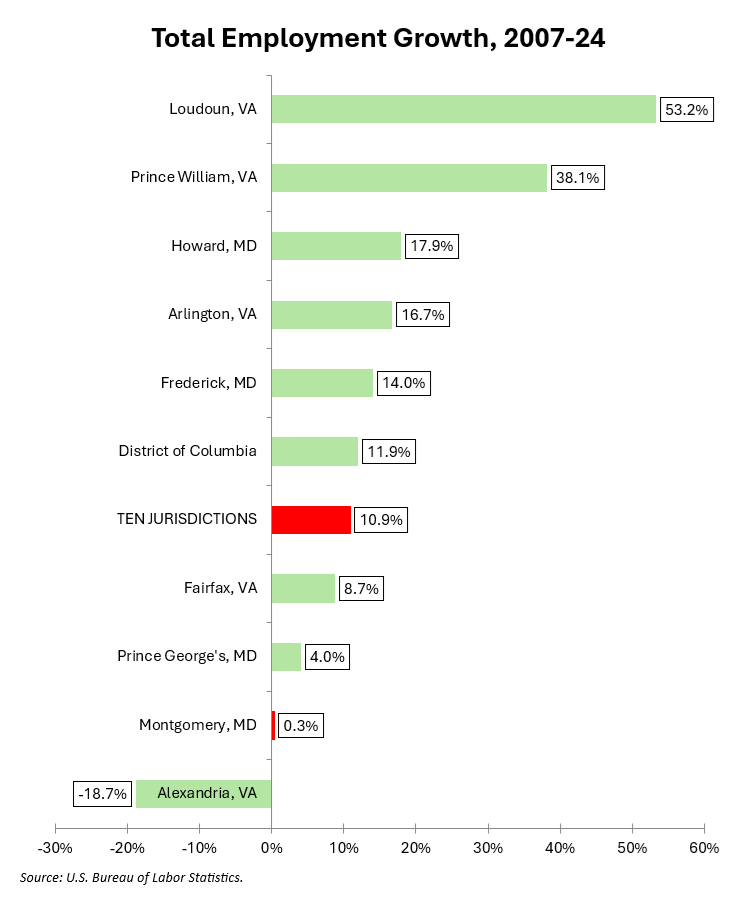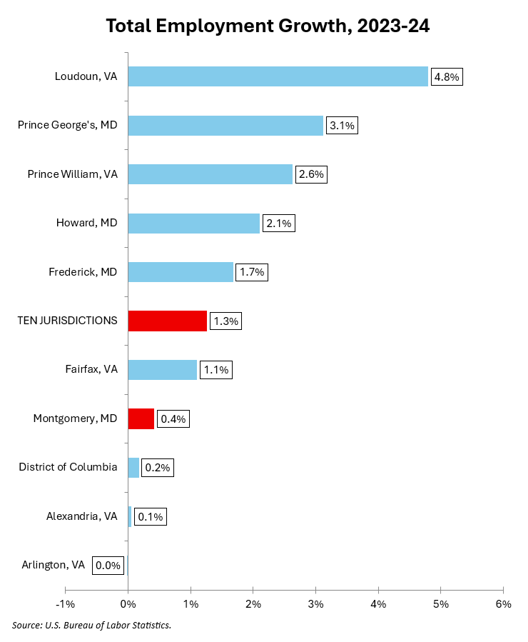 The chart below shows one-year growth of total employment in 2024 for MoCo and the other nine large jurisdictions in the region.