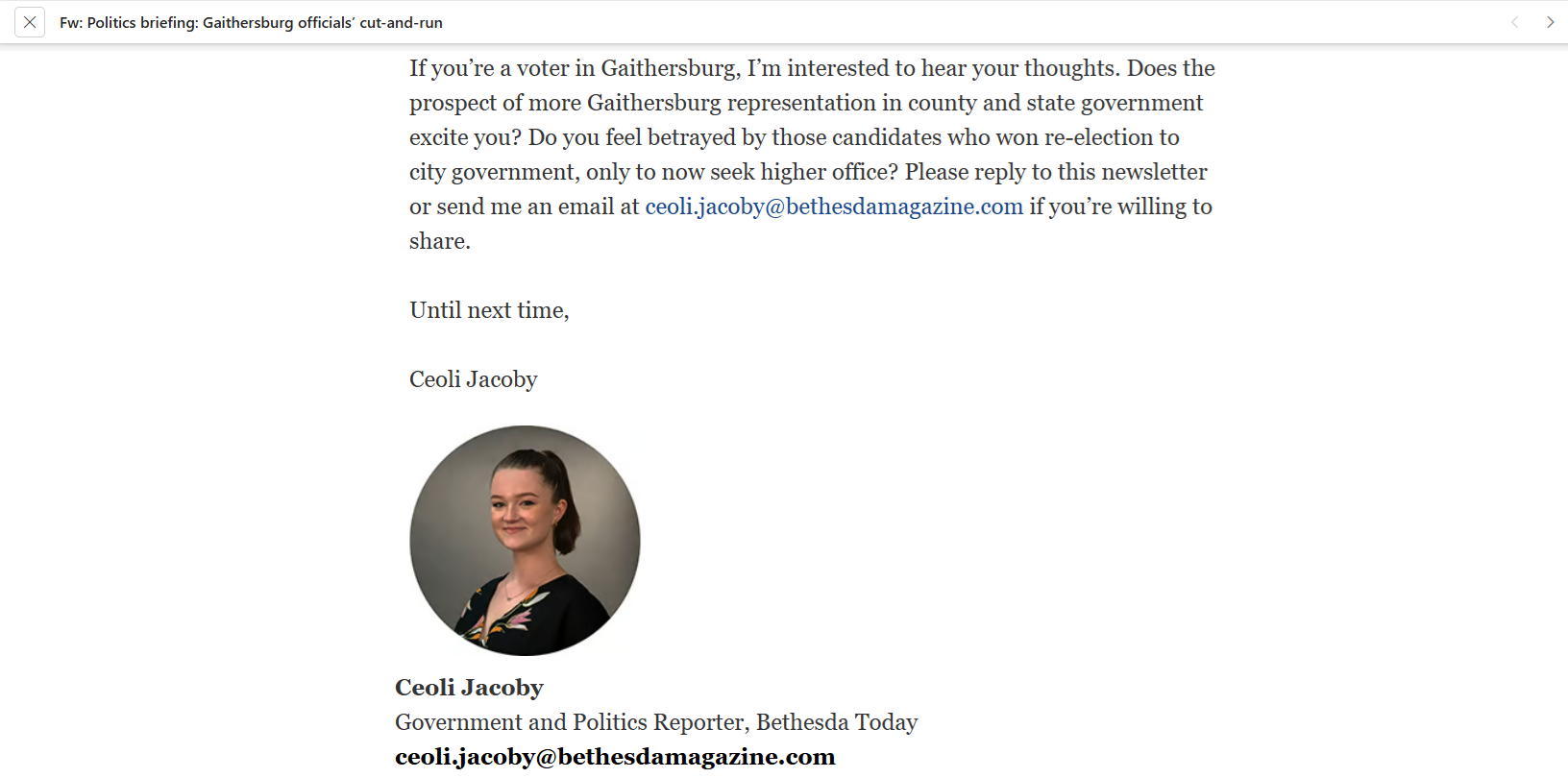 The piece in question is titled “Politics briefing: Gaithersburg officials’ cut-and-run.” It was an email written by Bethesda Today reporter Ceoli Jacoby on December 19. After noting that Gaithersburg Mayor Jud Ashman and Gaithersburg City Council Member Jim McNulty were just reelected to city office and are now running for county council, Jacoby wrote this: